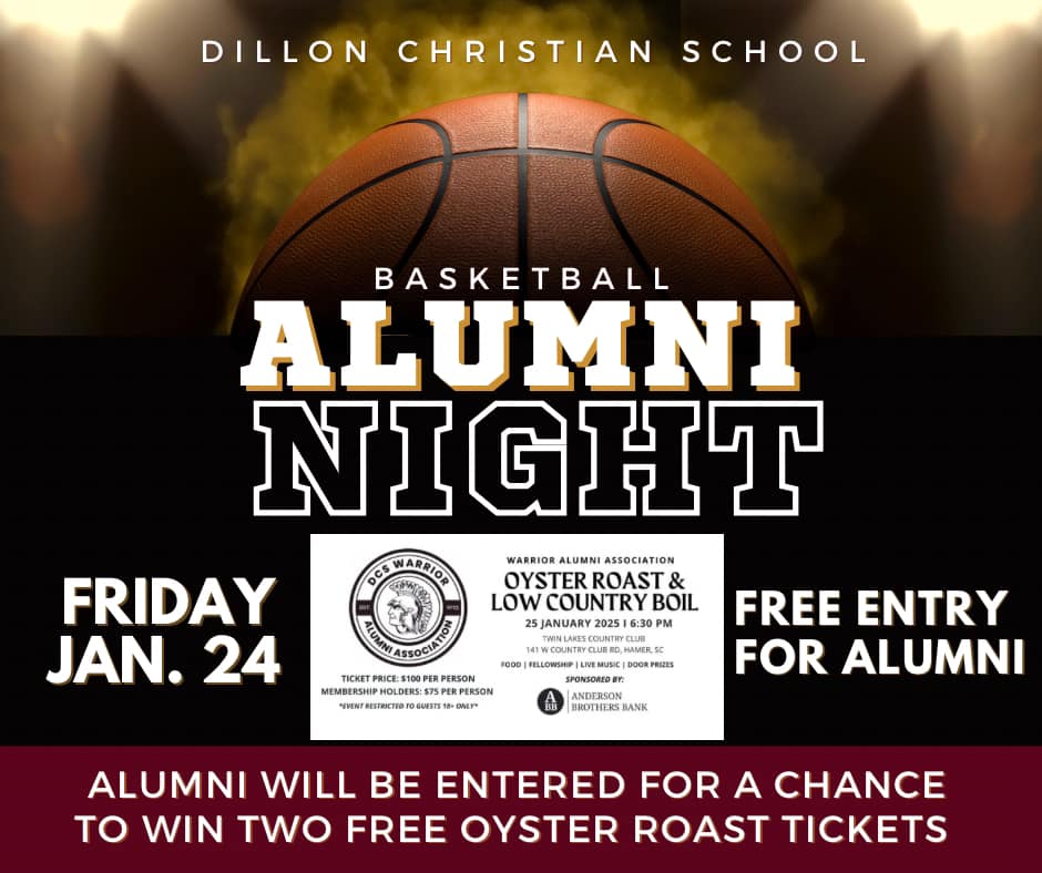 Friday, Jan. 24th: Alumni Night Basketball Game against Pee Dee Academy. (All former basketball players will be recognized between the Varsity girls and boys games.)