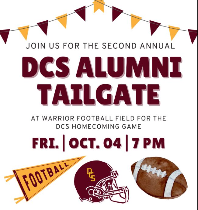 Join us for the Second Annual DCS Alumni Tailgate at Warrior Football Field for the DCS Homecoming Game! Come reconnect with old friends, enjoy some delicious food, and cheer on the Warriors at Homecoming!